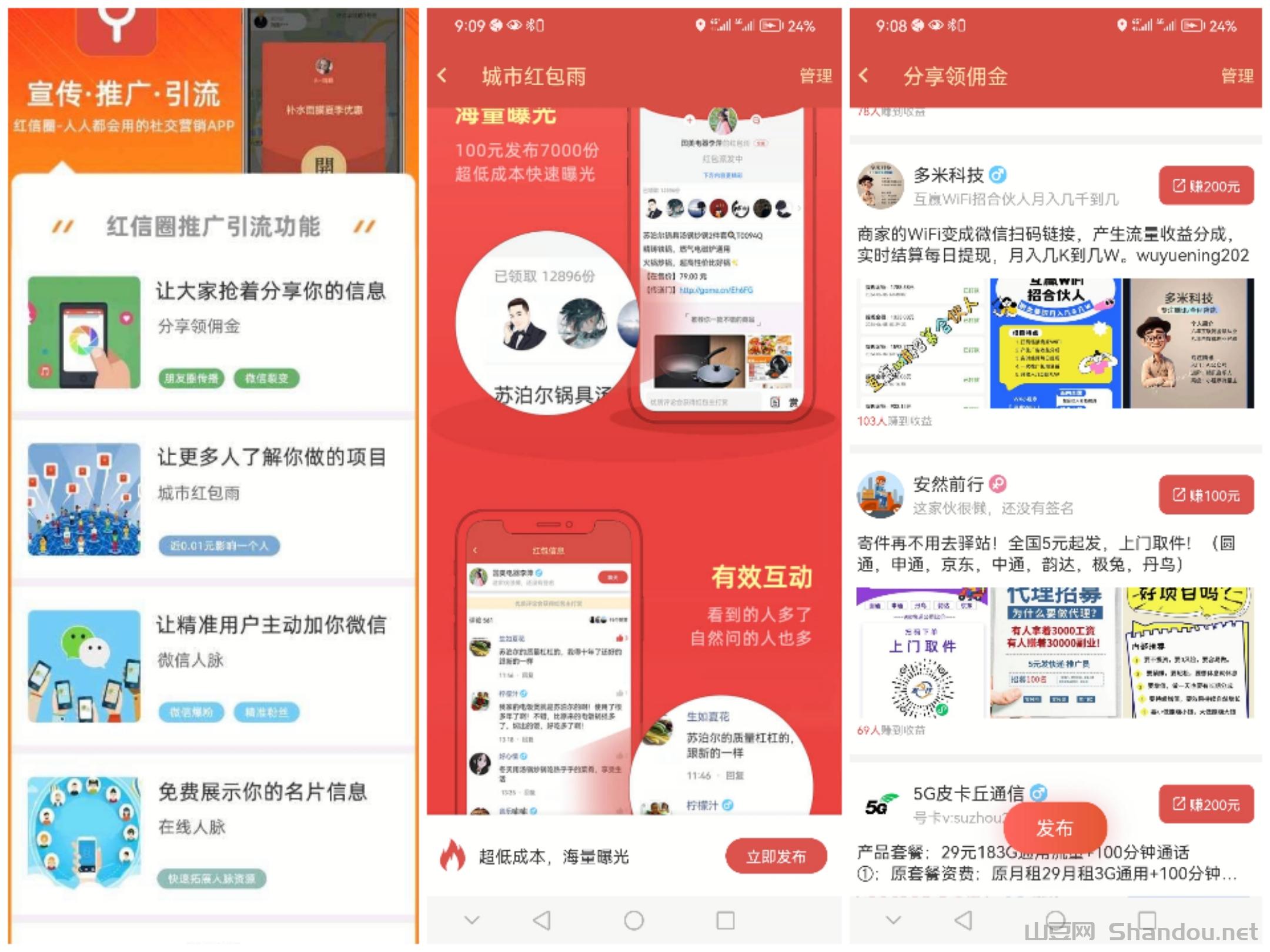 红信圈800万人在用的项目推广APP,多种引流推广功能,简单、有效、靠谱,永久免费抢红包满一元秒提现微信扫码下载,有好项目的可以试试分享赚佣金功能,和城市红包雨,这两个功能可以让你的项目获得更大曝光!还有悬赏兼职赚钱等等功能,微商网赚各大项目推广必备